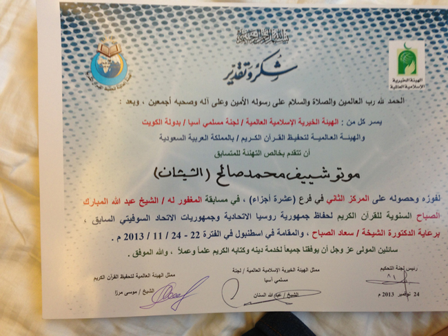 Выпускник Центароевской школы хафизов  им. З. Кадырова, стал призером международного конкурса хафизов в Турции